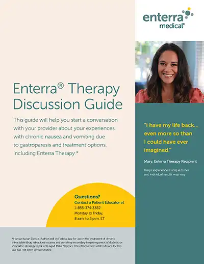 This discussion guide will help you start a conversation with your provider about your experiences with chronic nausea and vomiting due to gastroparesis and treatment options–including Enterra Therapy– and whether it might be right for you.
